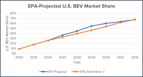 EPA’s original proposal estimated about 37 percent battery EV sales by 2027, 60 percent by 2030 and 67 percent by 2032.